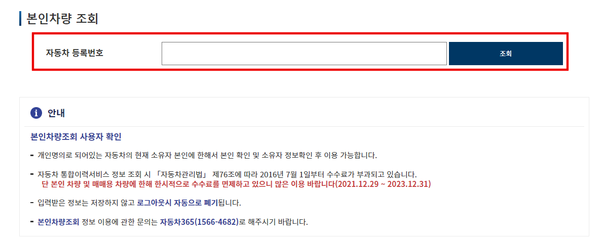 5. 조회하고자 하는 자동차 등록번호를 입력합니다.