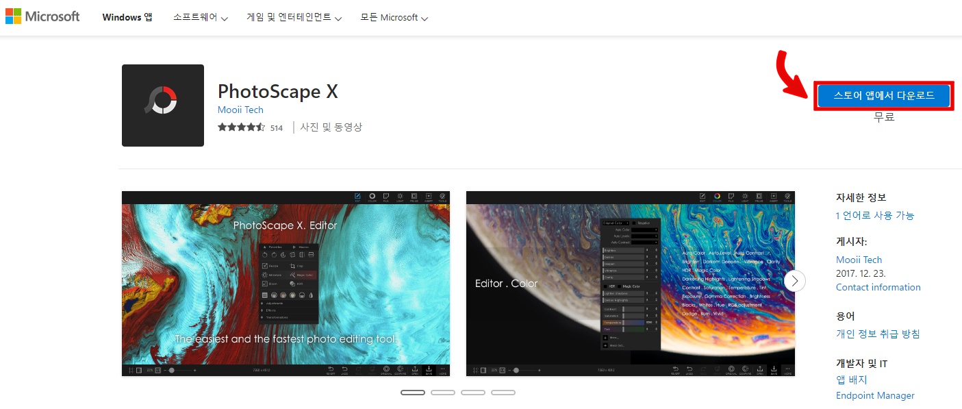 그러면 아래와 같이 마이크로소프트 스토어가 실행됩니다. 저는 이미 포토스케이프가 다운로드 되어있기 때문에 아래와 같이 열기라고 뜨지만, 처음 설치하시는 분들은 다운로드 버튼이 뜰겁니다. 여기서 다운로드 및 열기 버튼을 클릭하면 포토스케이프를 실행하실 수 있습니다.