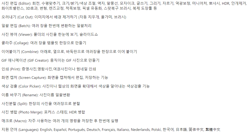 포토스케이프에서 지원하는 주요기능은 다음과 같습니다. 무료 버전인 점을 감안하고 봐도 일반적인 편집기능부터 콜라주, GIF 만들기 등 다양한 용도로 사용할 수가 있습니다.